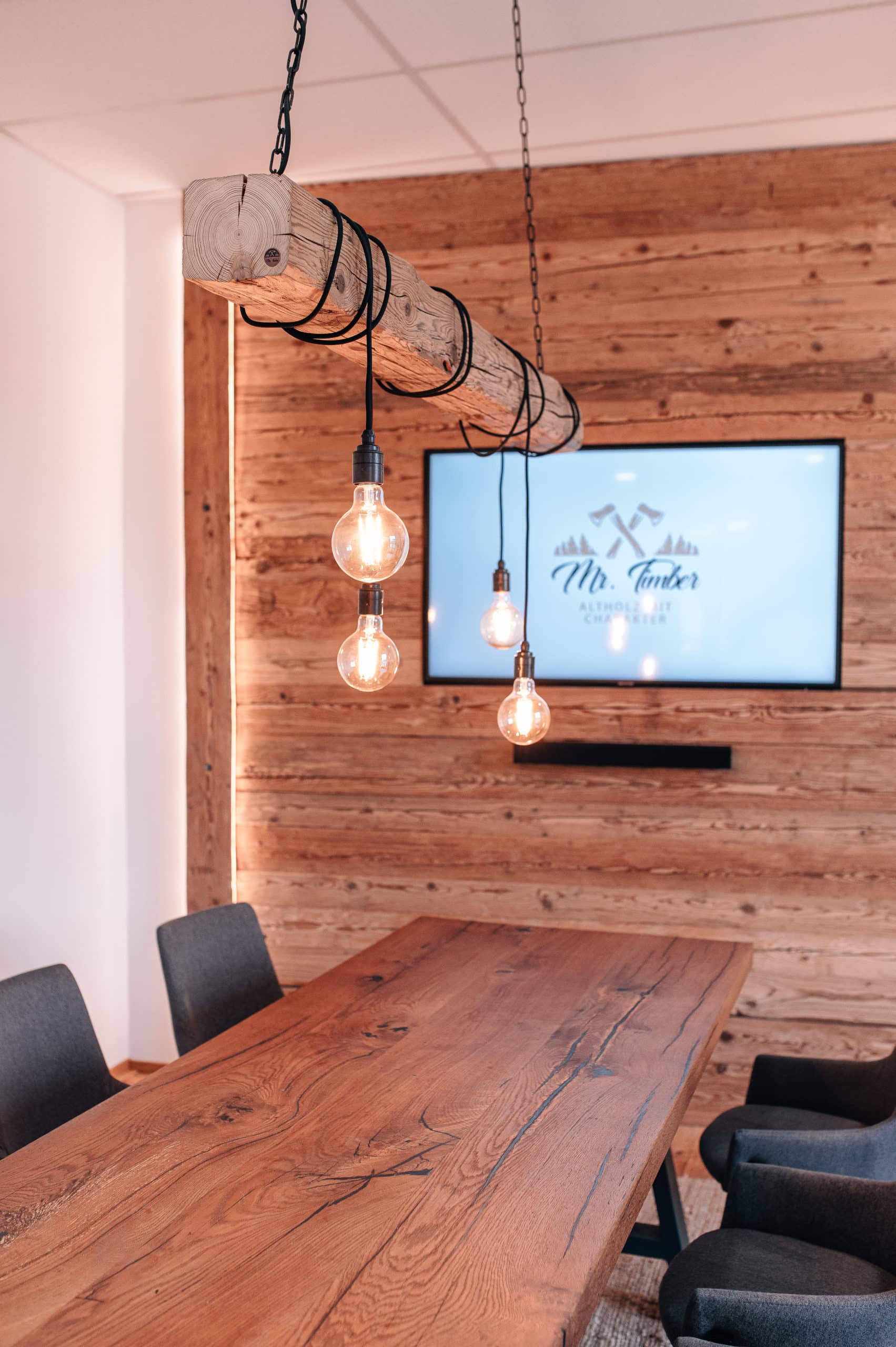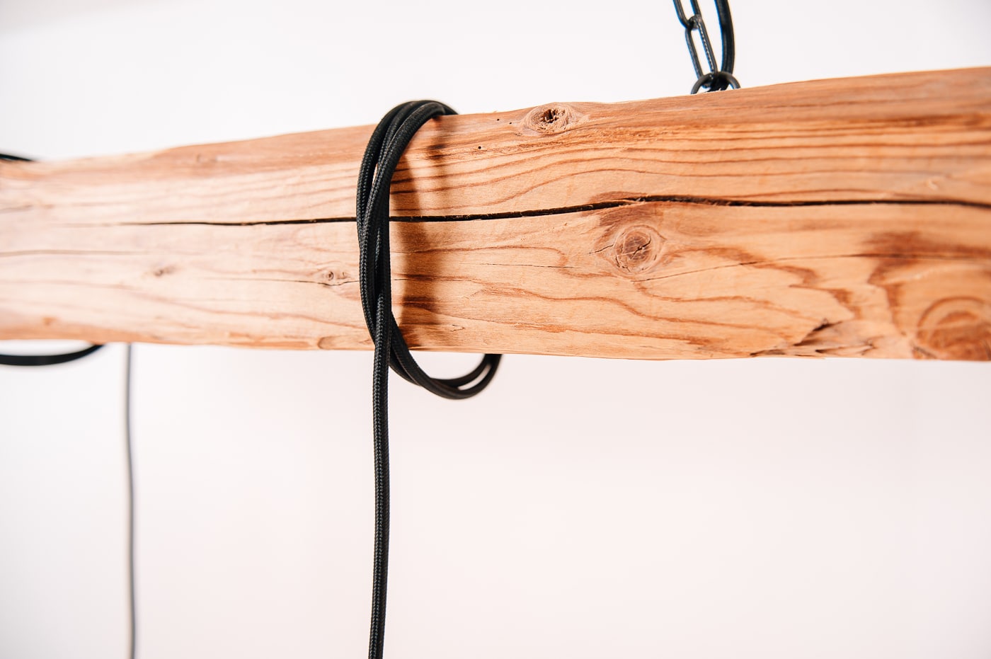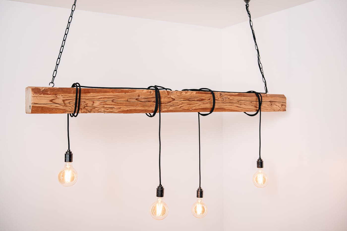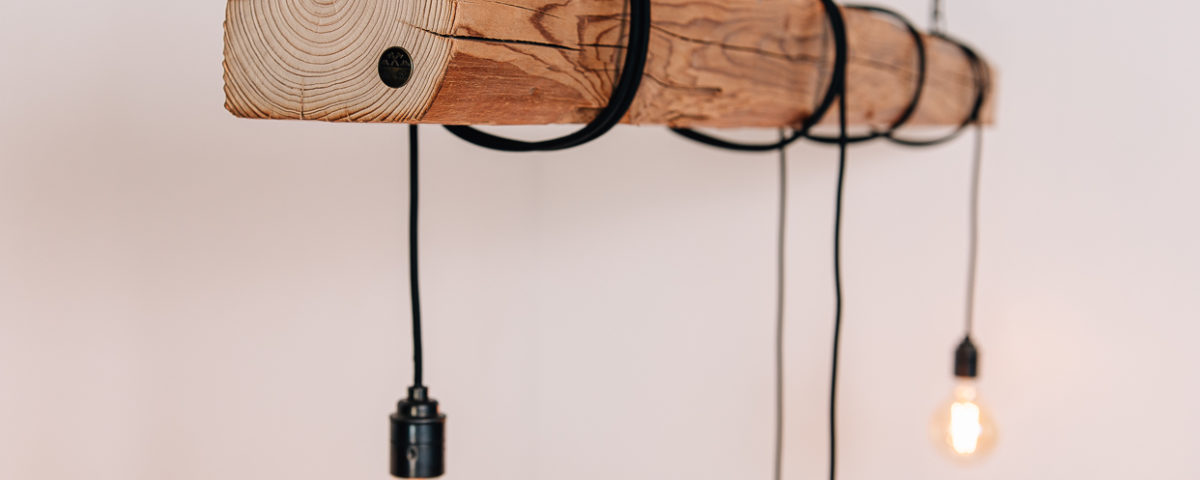 Aus unseren handgehackte Balken und passenden Kompenenten von unserem Partner Lightstock fertigen wir diese tollen Lampen