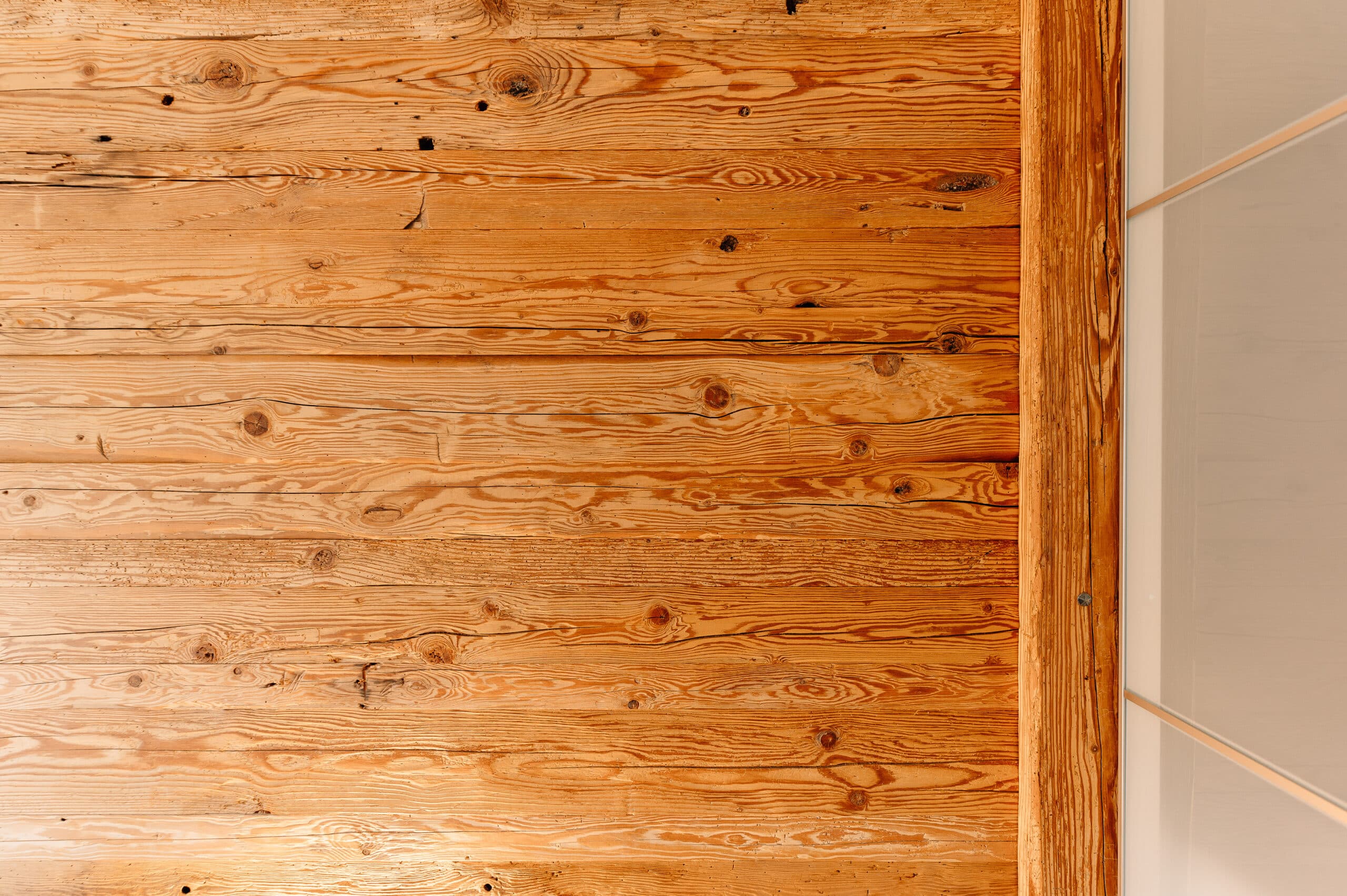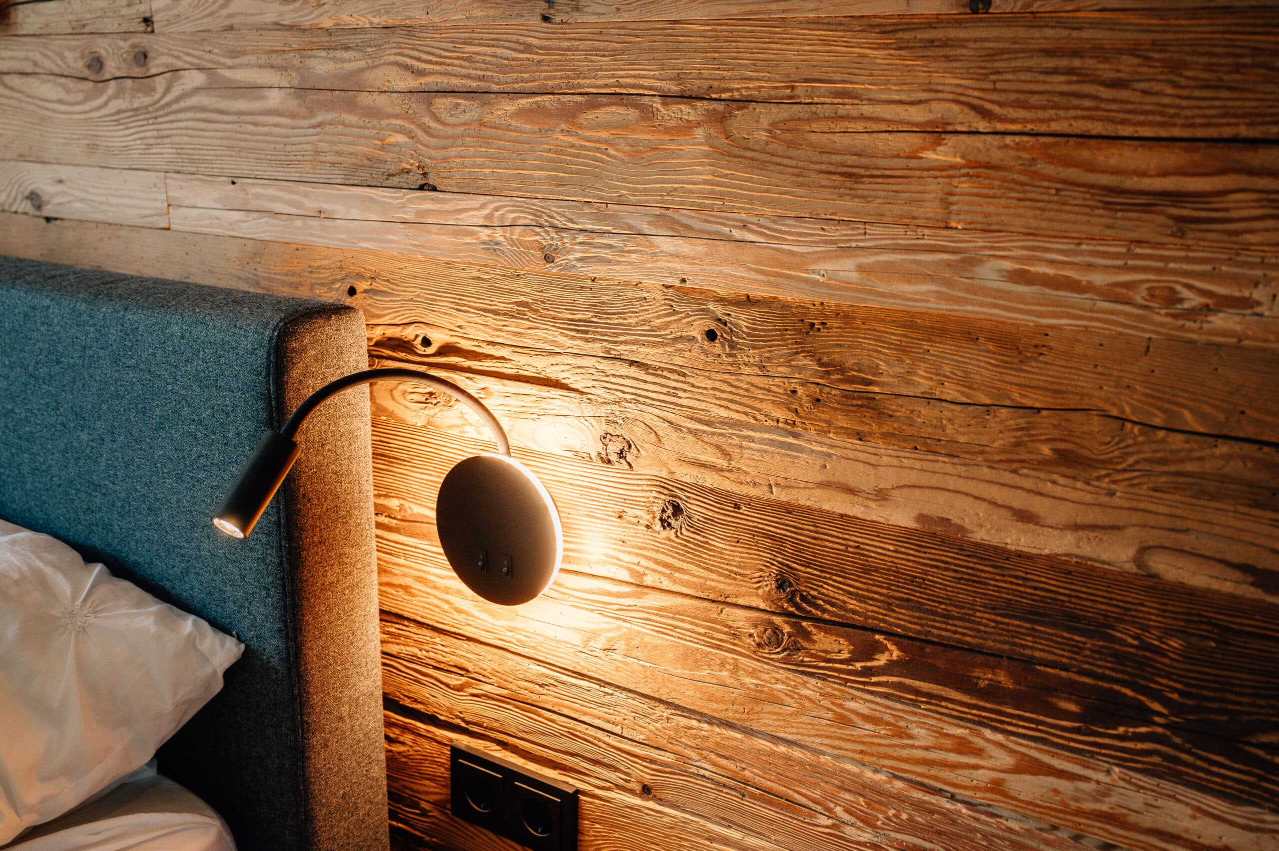 Wandverkleidung aus handgehacktem Altholz mit passendenAbschlussbalken, Beleuchtung und Leselampen in schwarz.