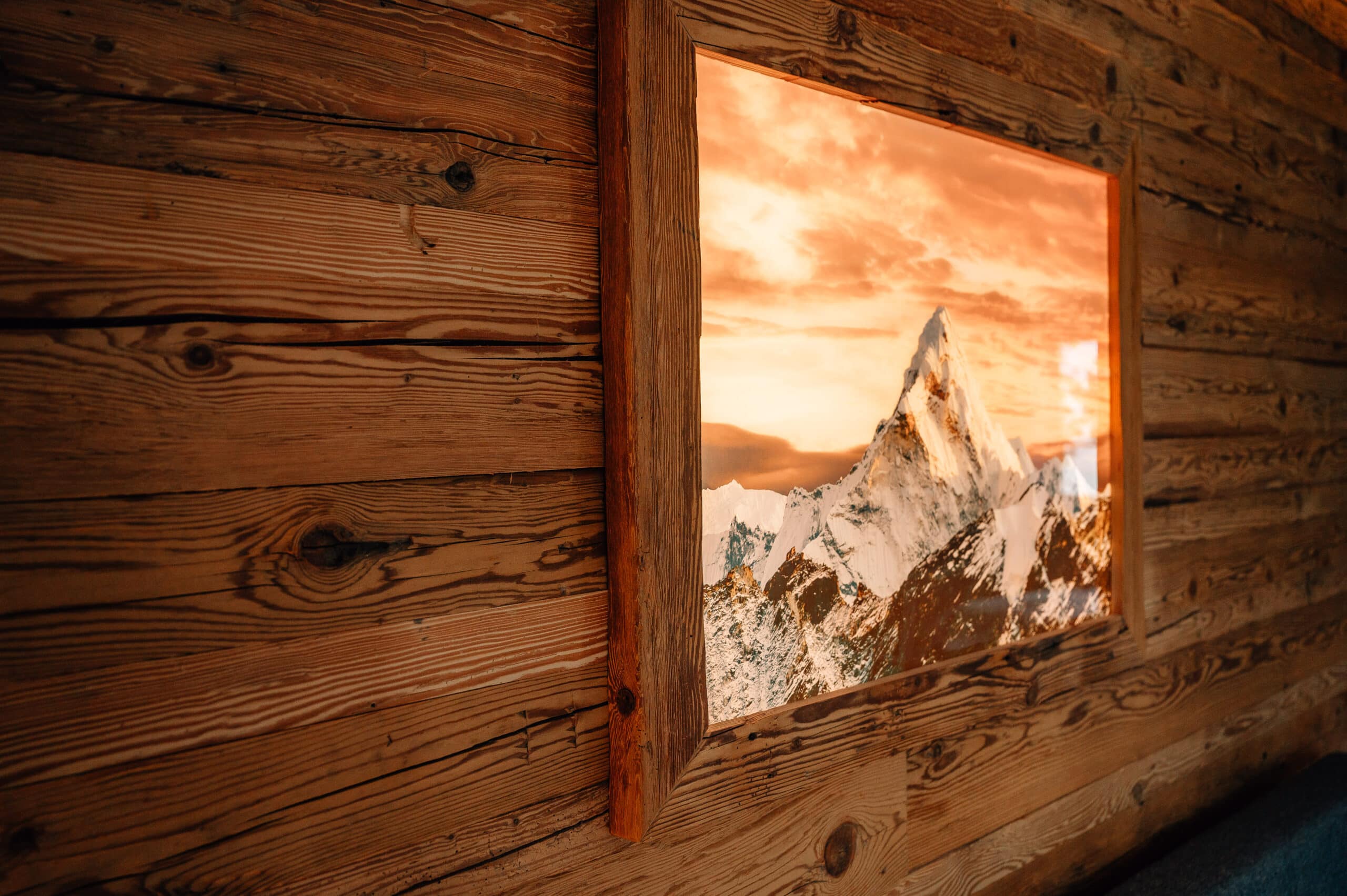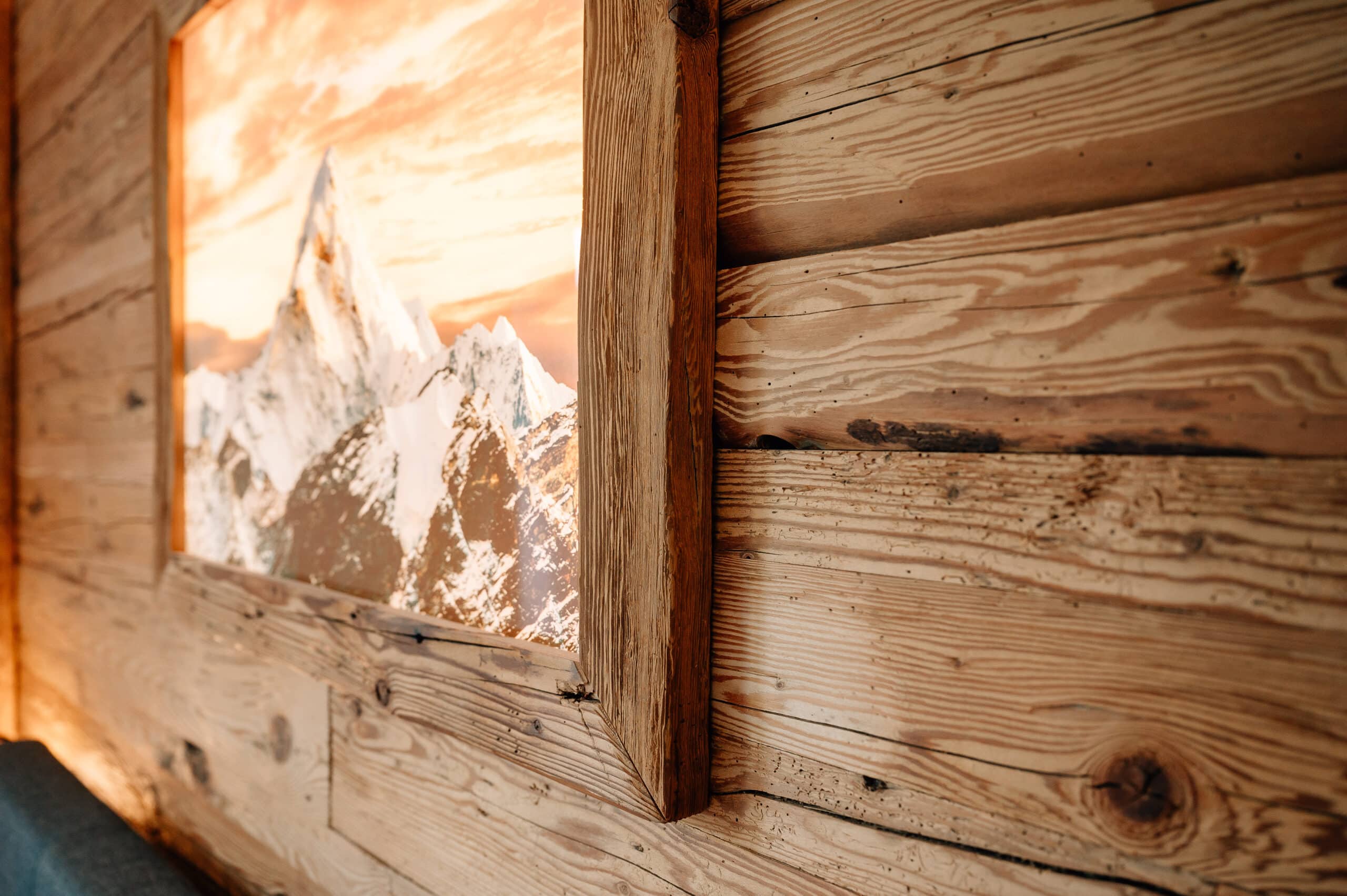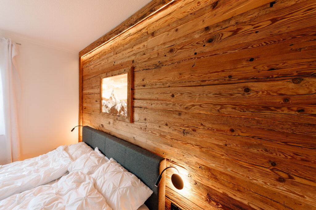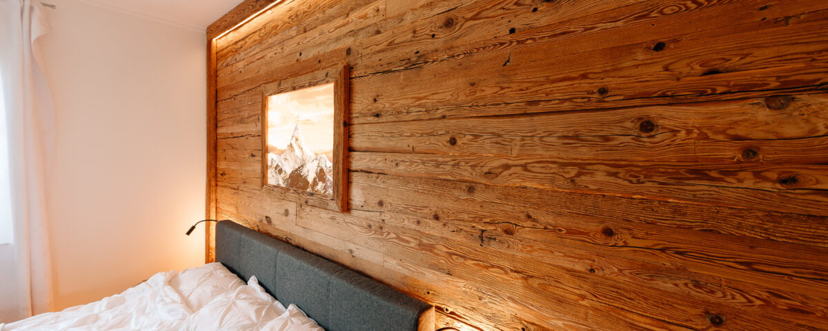 Almflair im Schlafzimmer? Kein Problem! Mit einer Wandverkleidung und einem wechselbaren hinterleuchtetem Motivbild zieht die Gemütlichkeit ein!