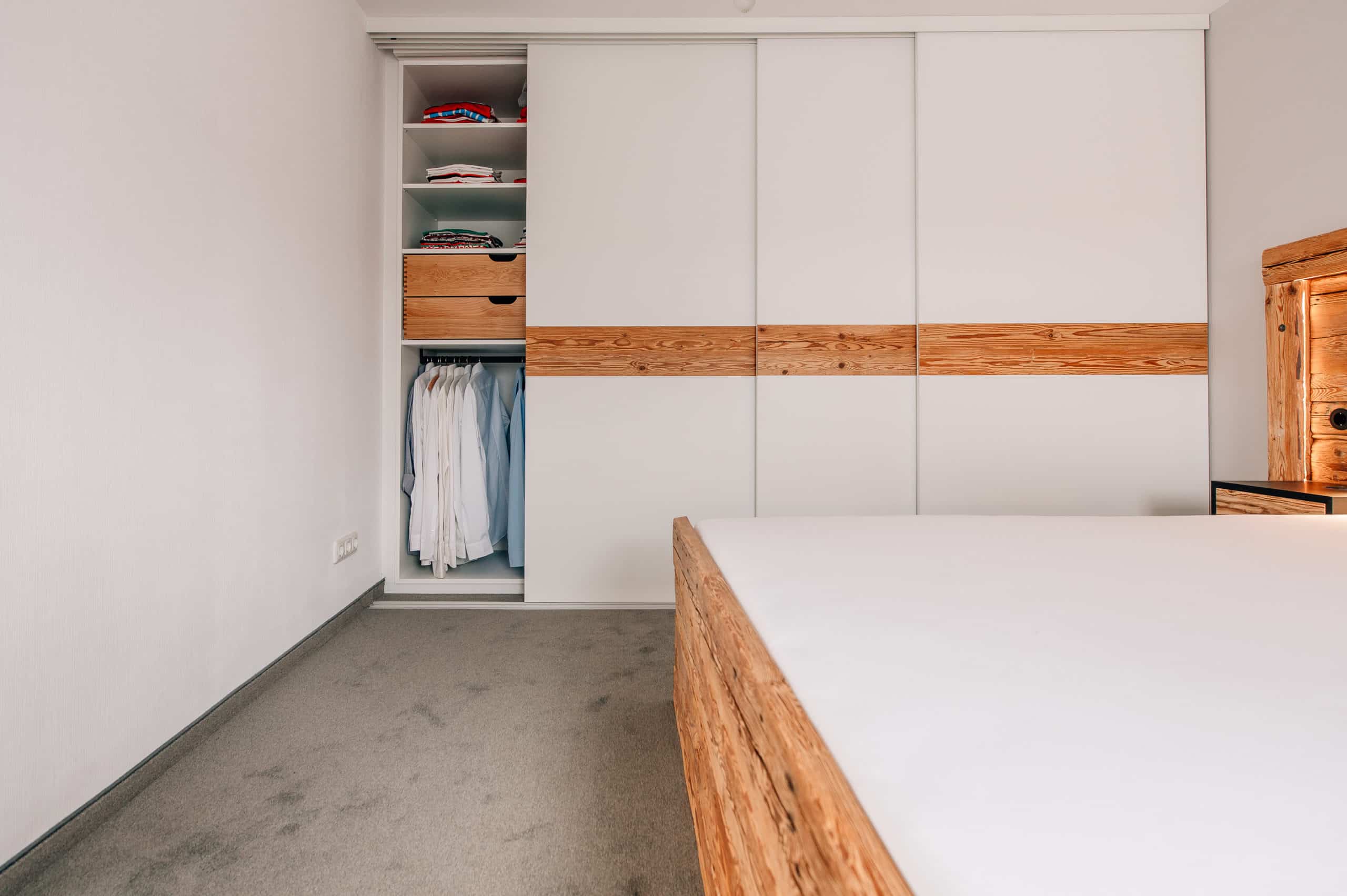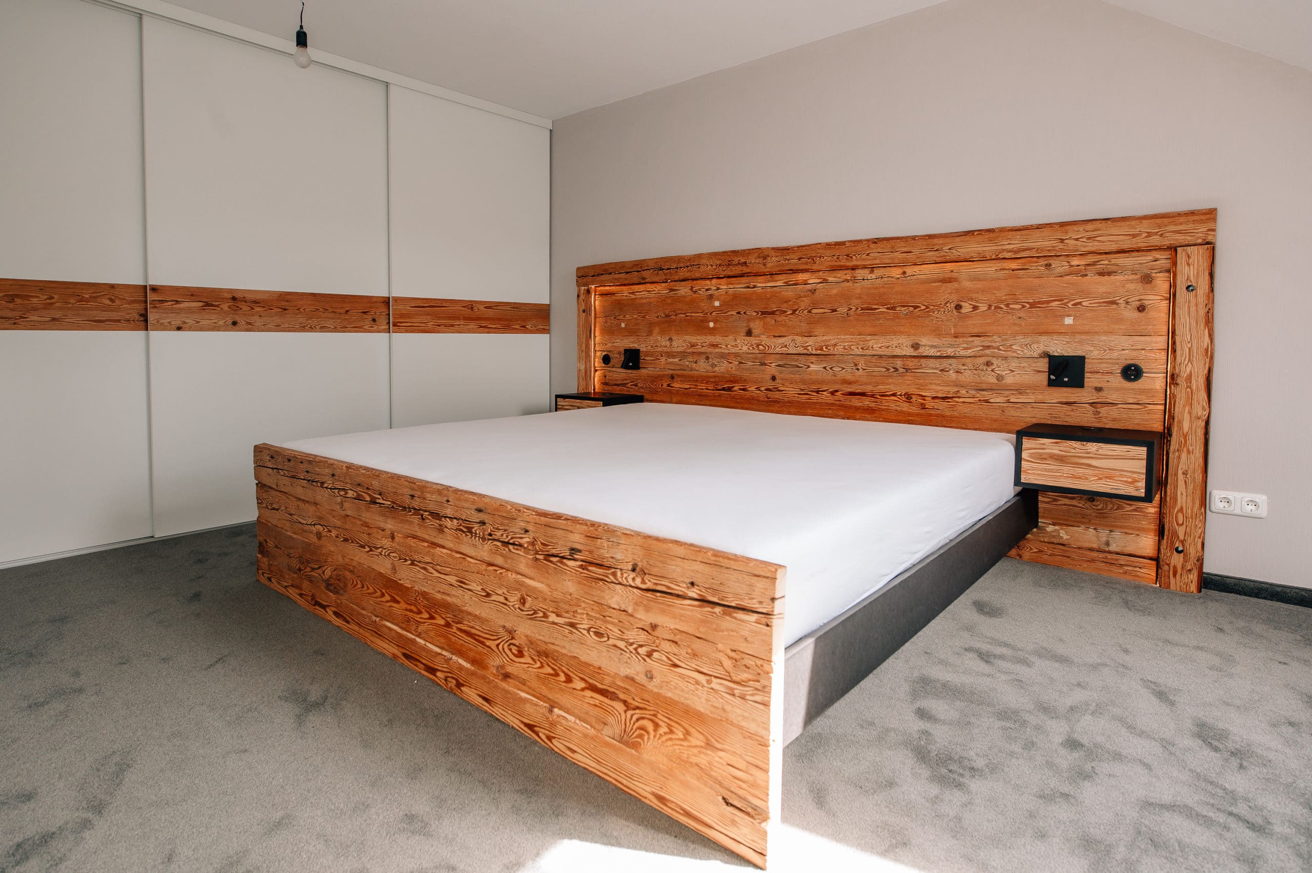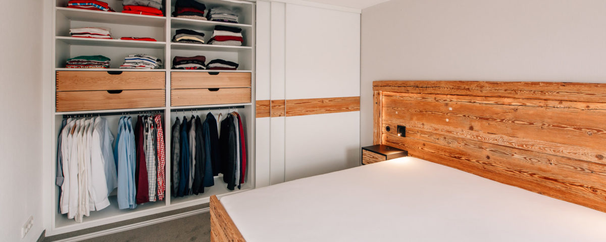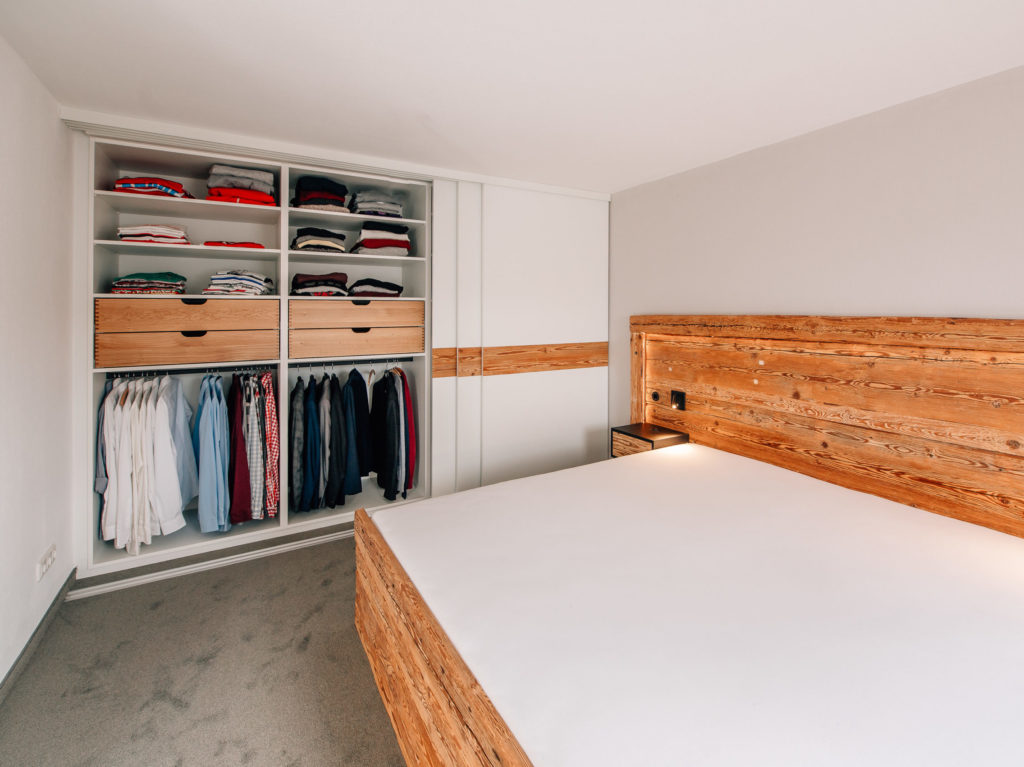 Schlafzimmer mit Einbauschränken, Schiebetüren und Bett aus handgehacktem Altholz und lackierten Fronten