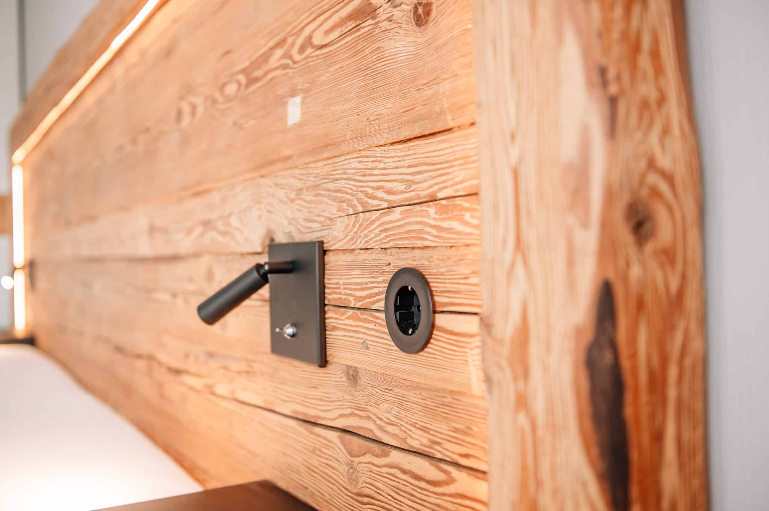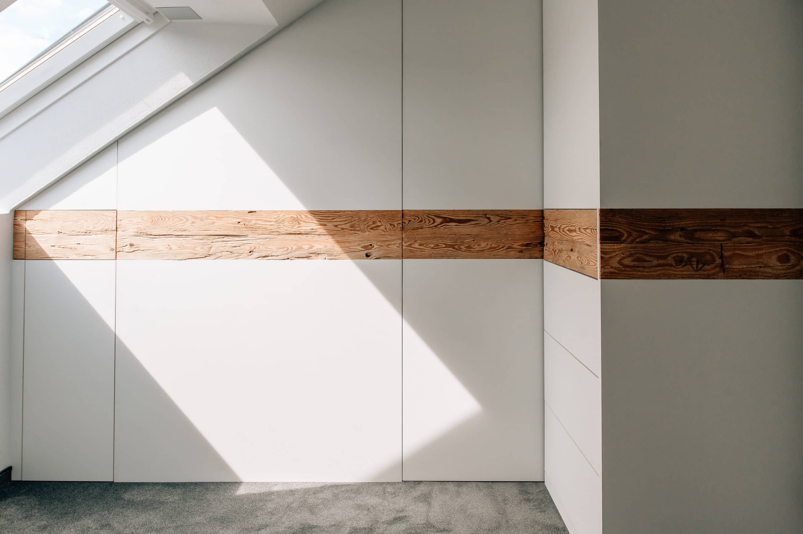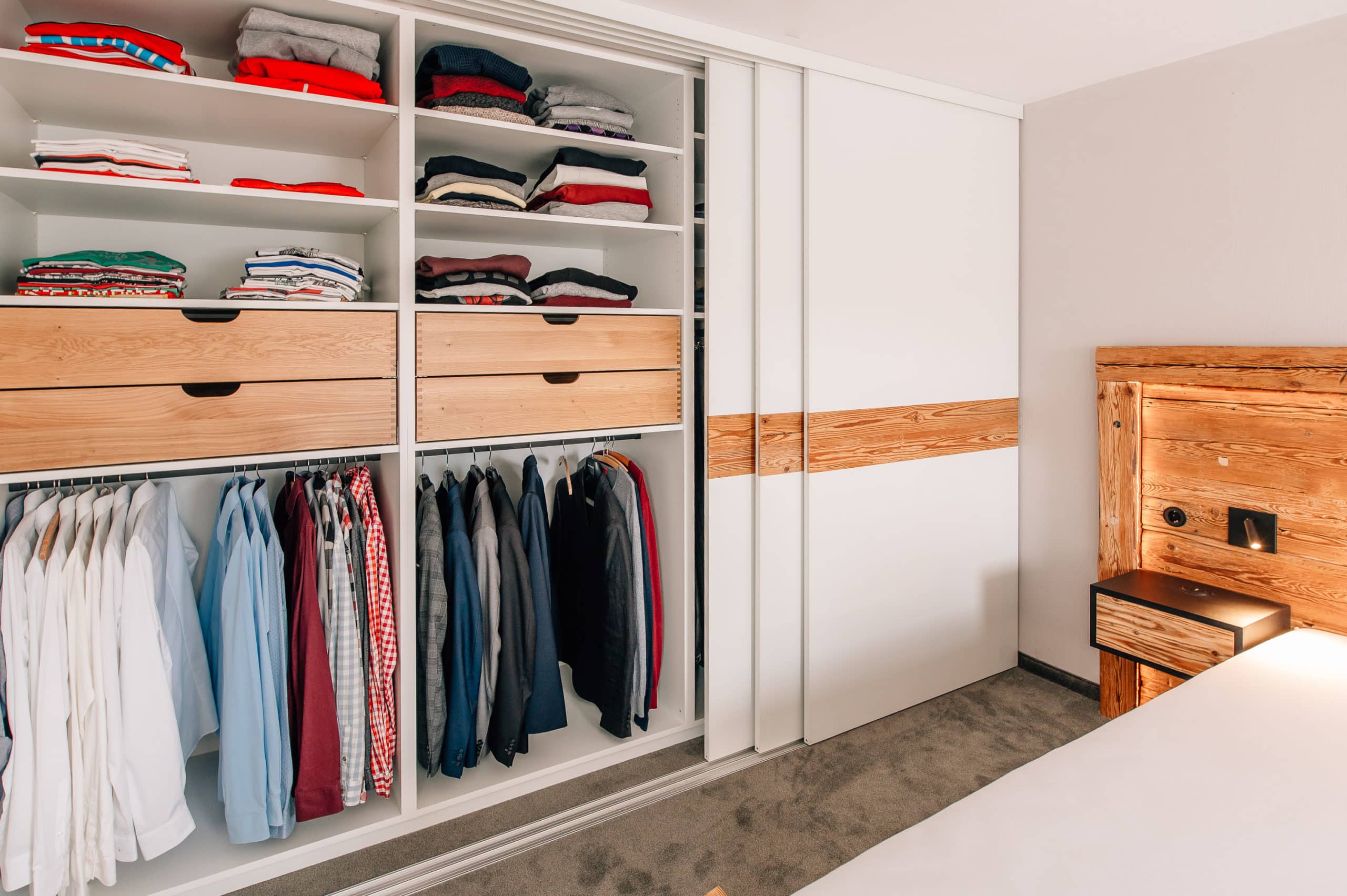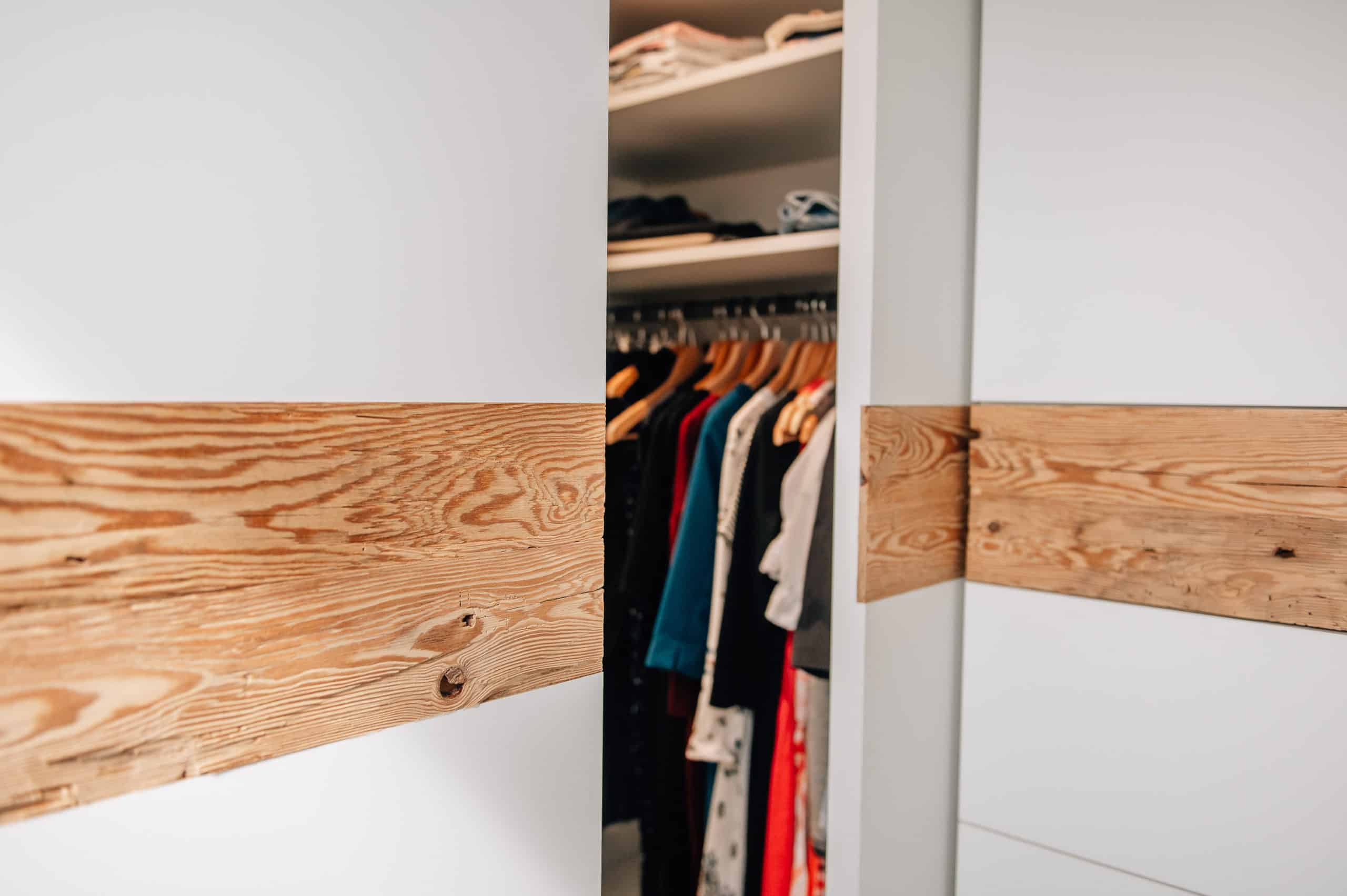 Schlafzimmer mit Einbauschränken, Schiebetüren und Bett aus handgehacktem Altholz und lackierten Fronten